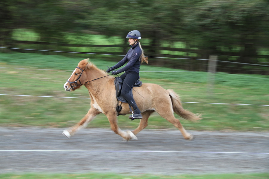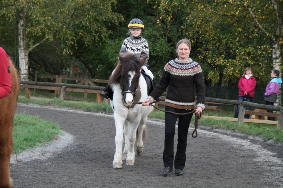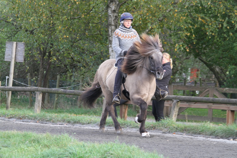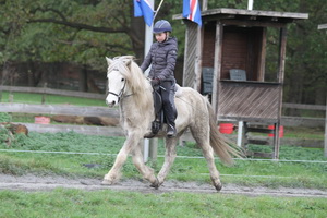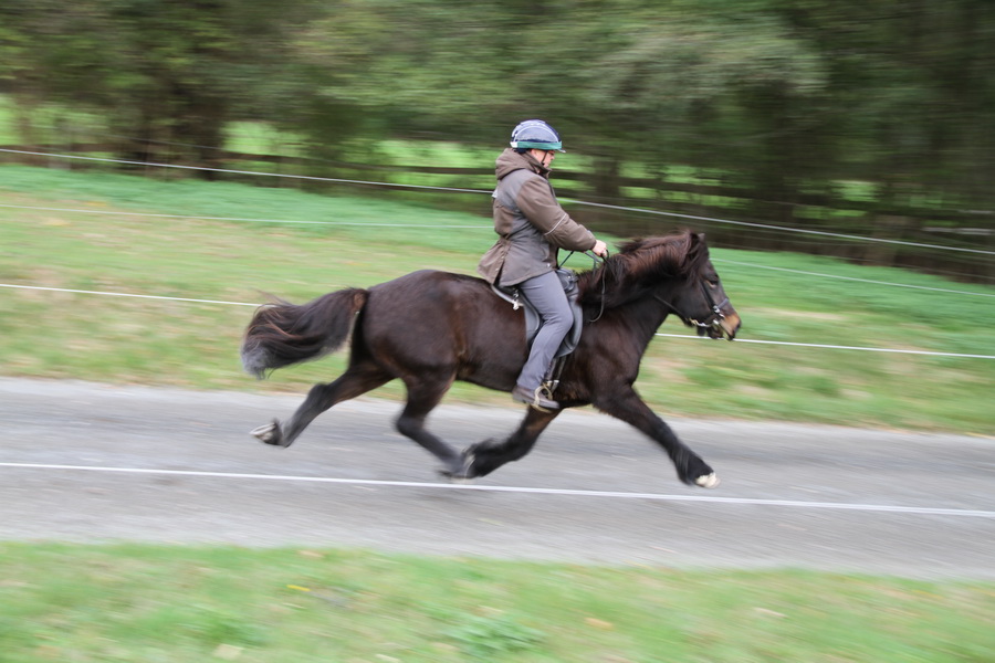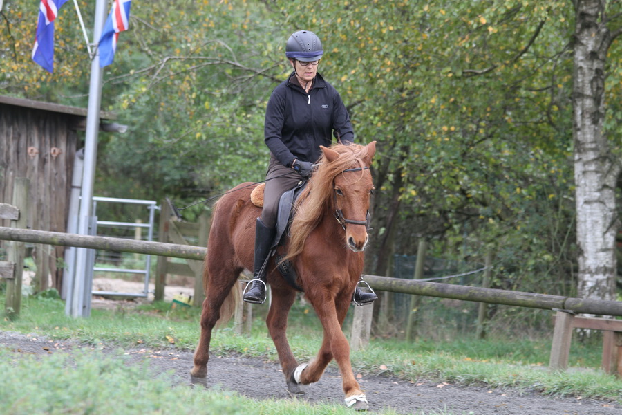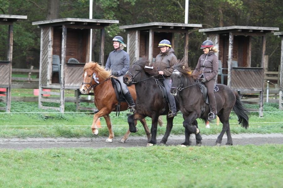 Viele motivierte Reiter reisten an, um zum Saisonende noch einmal auf Ovalbahn, Passbahn und dem Trailplatz in lockerer Atmosphäre zu starten. Der entspannte Rahmen war auch für Turnierneulinge perfekt, - der Ausflug von der Ovalbahn auf's Grüne wurde nicht mit Disqualifikation bestraft und Zuschauer wie auch der Sprecher durften ein bisschen helfen, wenn der Außengalopp nicht sofort bemerkt wurde. Die Bandbreite (vom Einsteiger bis zum erfahrenen Reiter und vom jungen Pferd, erstmals auf einer fremden Bahn, bis zum 19jährigen Tölt und Galoppstar Lótto) wie auch die individuelle Gestaltung der verschiedenen Prüfungen ließen keine Langeweile aufkommen. Erstaunlich viele Zuschauer folgten dem abwechslungsreichen Programm, bei dem man von Führzügelklasse bis zu sehr guten Vorstellungen in Tölt, Viergang und Rennpass alles zu sehen bekam. Es wurde viel applaudiert, mitgefiebert und es blieb auch Zeit für nette Gespräche im Haustkeppni - Café.